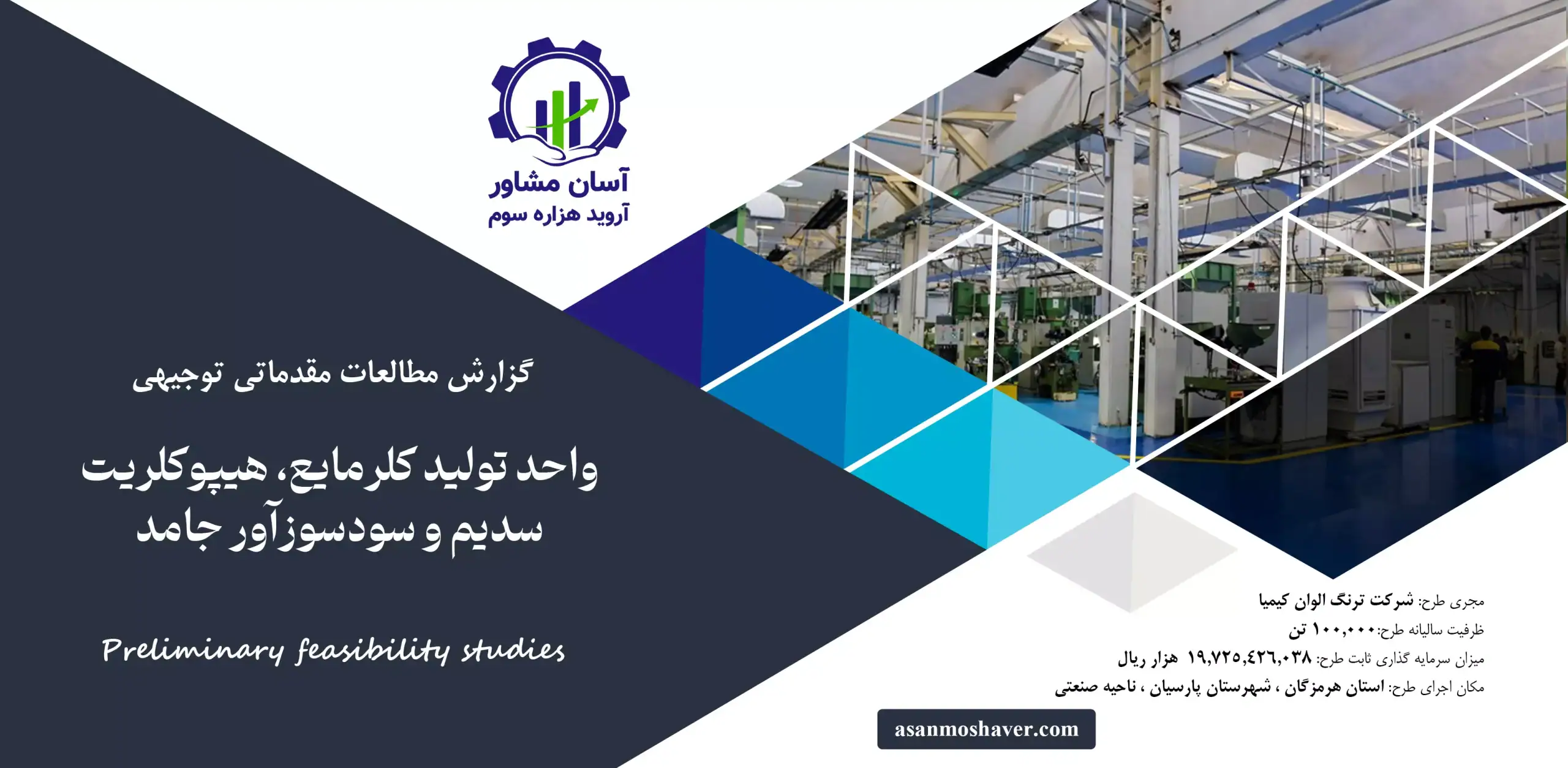 • عنوان پروژه: گزارش مطالعات مقدماتی توجیهی احداث واحد تولید کلرمایع، هیپوکلریت سدیم و سودسوزآور جامد